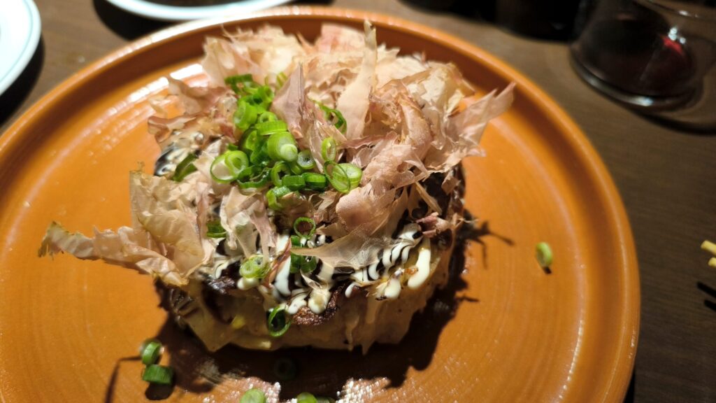 締めにホテル近くのワインバー&お好み焼きというちょっとおしゃれなお店におっさん二人でごー!