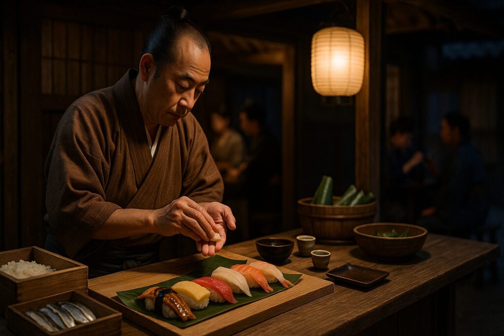 屋台発の“一貫ずつ握る”スタイル。ヅケ(醤油漬け)・酢締め・湯霜・煮穴子+煮詰めなどの前処理で、冷蔵のない都市に最適化。
